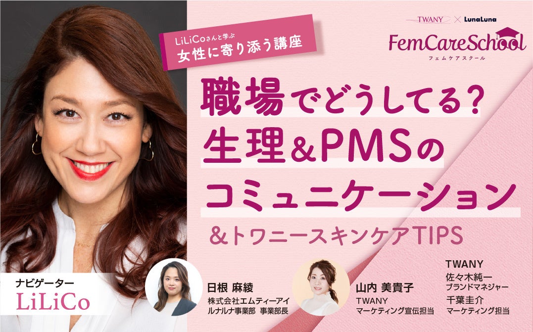 オンライン講座では、日本の生理や性教育などの学習が、まだまだ閉鎖的な環境であることや、美容を学び、楽しむ機会を作ることに目を向け、「ルナルナ」からは女性のヘルスケア情報、「トワニー」からは美しさのリズムに着目した美容情報を提供し、ヘルスケアと美容のそれぞれの知見から講座を展開しております。今回は生理と月経前症候群(以下「PMS」)の時の職場でのコミュニケーションに焦点を当てた講座と、乾燥でデリケートになりがちなときの美容に関する情報をお届けします。