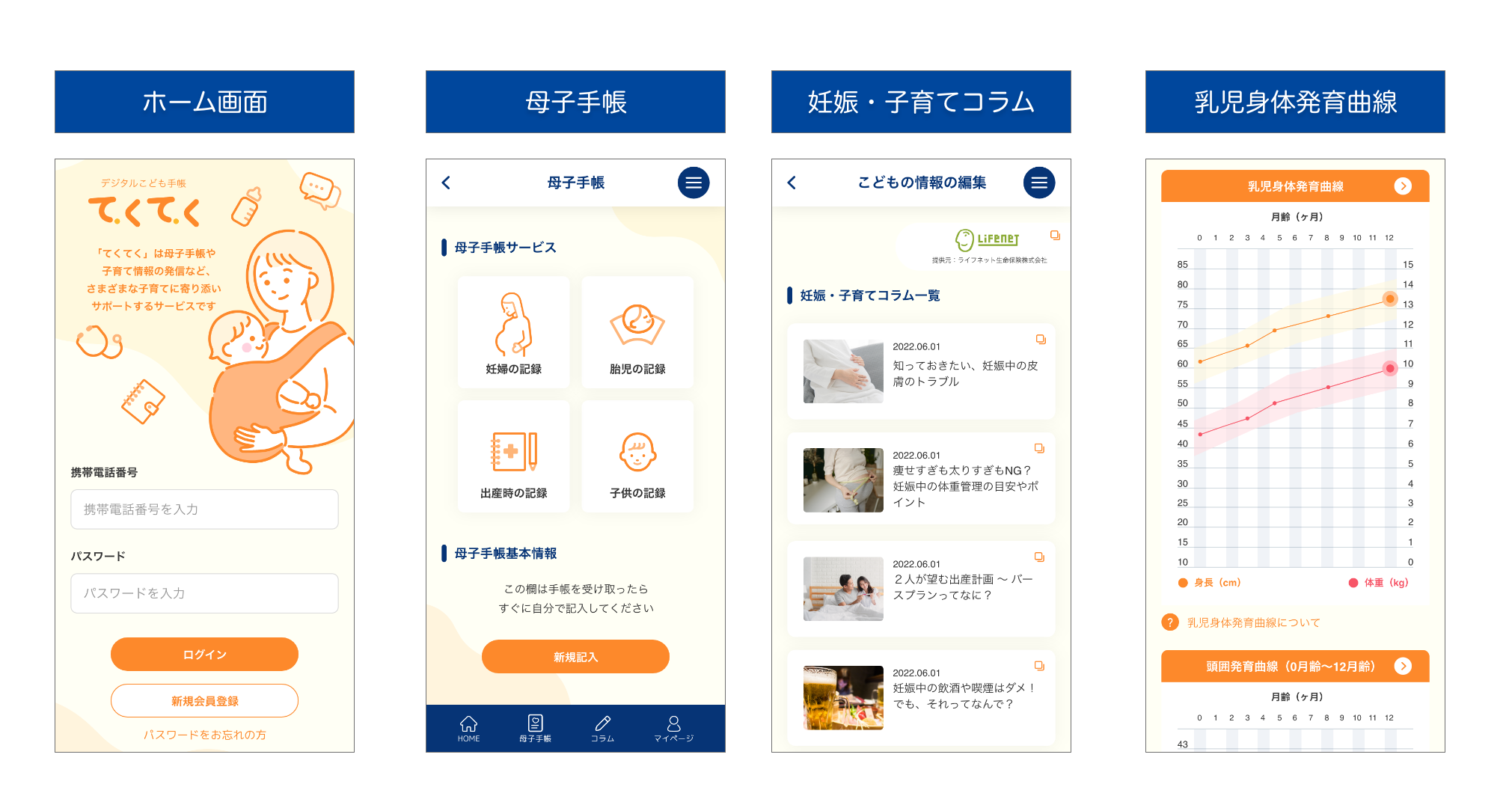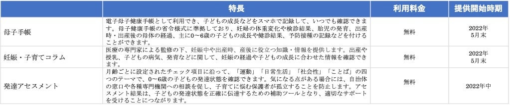 「てくてく」の「母子手帳」機能は、母子健康手帳の省令様式に準拠しており、妊娠中や出産時の記録に加えて、主に0〜6歳の子どもの成長や健診結果、予防接種の記録などを付けることができます。「妊娠・子育てコラム」では、医療の専門家による監修の下、妊娠中や出産時、産後に役立つ情報を提供します。コラムのコンテンツの提供などにおいては、ライフネット生命保険株式会社が協力します。また、従来の母子健康手帳にはなかった機能として、月齢ごとに設定されたチェック項目に沿って子どもの発達状態を確認し、必要に応じて自治体が設置する専用窓口への相談を促す「発達アセスメント」機能の追加を、2022年中に予定しています。さらに、食事や睡眠などの生活に関する記録を付けられる「育児記録」機能や、各種予防接種のスケジュール管理ができる機能を追加する他、ヤフー株式会社との連携により、妊娠の届け出や児童手当の現況届などの行政手続きをオンラインで申請できる「Yahoo!くらし」に、「てくてく」から直接アクセスできるようにする予定です。2023年以降には、政府が運営するオンラインサービス「マイナポータル」上の予防接種記録を、「てくてく」に自動的に反映することも見据えています。