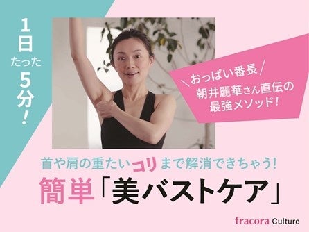 先端美容を追求し、エイジングケア美容液No.1※1ブランドの「fracora(フラコラ)」は、バストのカリスマ 朝井麗華さんをお招きし、「首や肩の重たいコリまで解消できちゃう!簡単「美バストケア」」全5回を、2022年5月14日(土)10:00よりfracoraカルチャーにて配信いたします。