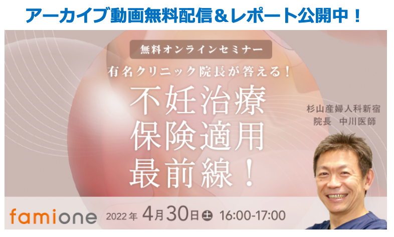「子どもを願うすべての人によりそい 幸せな人生を歩める社会をつくる」をビジョンに掲げ、LINEを活用した妊活コンシェルジュサービス「famione(ファミワン)」 https://lp.famione.com/ を提供する株式会社ファミワン(本社:東京都渋谷区、代表取締役:石川 勇介、以下当社)は、杉山産婦人科(東京都世田谷区、理事長 杉山力一)の新宿院長 中川浩次先生を講師にお迎えし、オンラインセミナー「有名クリニック院長が答える!不妊治療保険適用 最前線」の無料開催を行いました。告知開始時は100名限定としていましたが好評につき300名と大幅に増枠。当日までに合計404名の参加申込があり、興味関心の大きさをうかがい知ることができました。