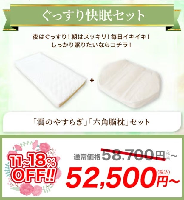 理想の高さで寝られる、肩・首に優しい「枕」と理想の寝姿勢により“まるで浮いているみたいな寝心地”を実現した「高反発マットレス/敷布団」の快眠セット。