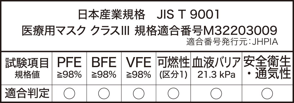 1.  JIS T9001 医療用マスク クラスⅢ適合