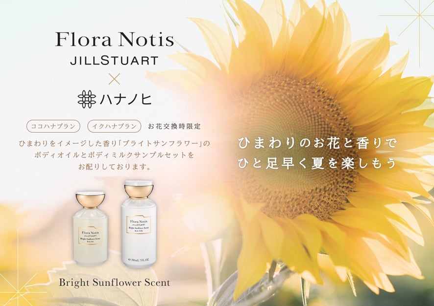また同時期に、フローラノーティスの店舗・ECでは「ブライトサンフラワー」の限定キットの発売や多数特典をご用意しておりますので、是非この機会にフローラノーティスの「ブライトサンフラワーの香り」とハナノヒが提供する「ひまわりのお花」で一足早く特別な夏を過ごしてみませんか。
