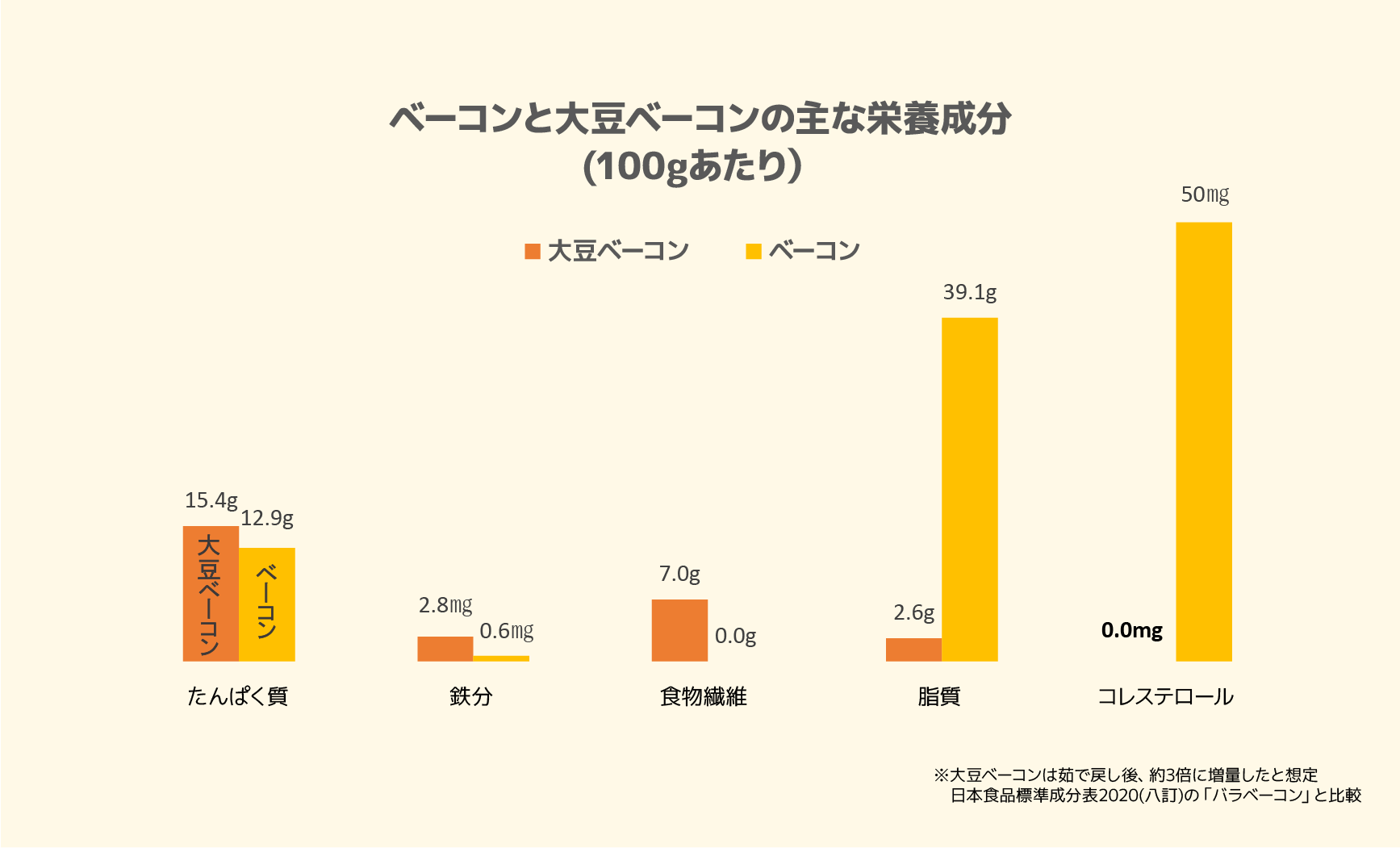 従来の豚肉ベーコンの栄養素と比べると、鉄分が4倍、食物繊維は7倍にもなります。さらに、脂質93%オフ、コレステロールはゼロなので、健康を気遣う方にも安心。もちろん植物性たんぱく質も豊富です。豚肉ベーコンではありえなかった、常識をくつがえす大豆ベーコンの商品化が実現しました。大豆丸ごとから作られており、合成着色料や保存料、化学調味料は不使用です。
