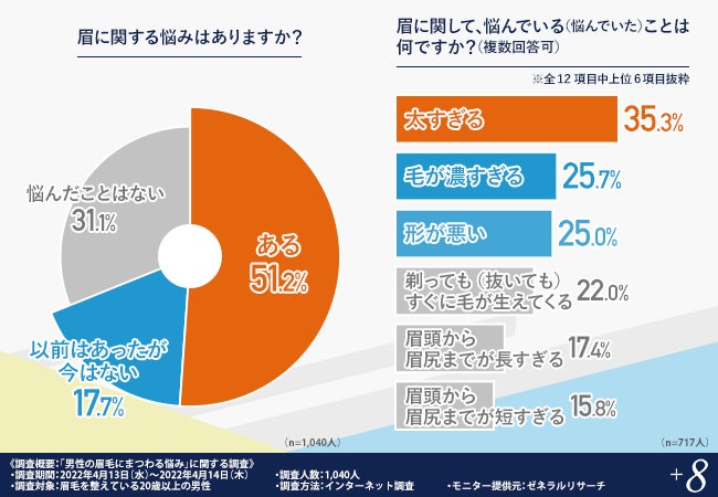 そこで今回、株式会社プラスエイト(https://www.plus8.bz/)は、20歳以上の男性を対象に、「男性の眉毛にまつわる悩み」に関する調査を実施しました。
