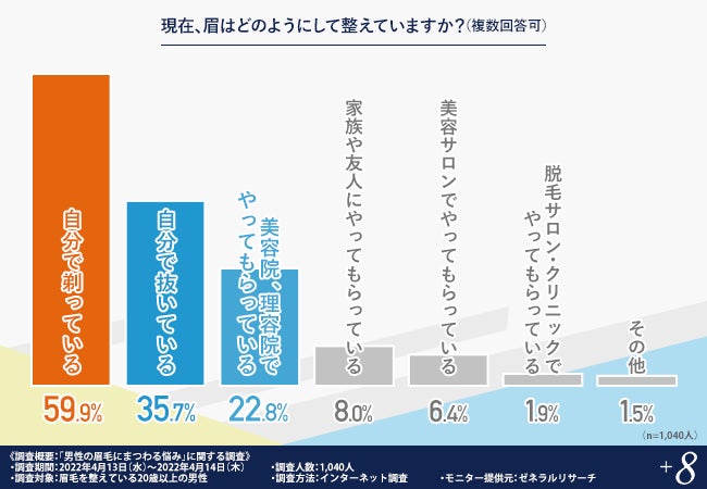 そこで、「現在、眉はどのようにして整えていますか?(複数回答可)」と質問したところ、『自分で剃っている(59.9%)』と回答した方が最も多く、次いで『自分で抜いている(35.7%)』『美容院、理容院でやってもらっている(22.8%)』『家族や友人にやってもらっている(8.0%)』『美容サロンでやってもらっている(6.4%)』と続きました。