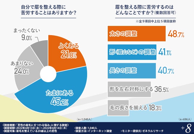 そこで、「自分で眉を整える際に苦労することはありますか?」と質問したところ、6割以上の方が『よくある(21.8%)』『たまにある(45.2%)』と回答しました。