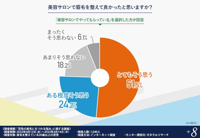 そこで、「美容サロンで眉毛を整えて良かったと思いますか?」と質問したところ、7割以上の方が『とてもそう思う(51.5%)』『ある程度そう思う(24.2%)』と回答しました。