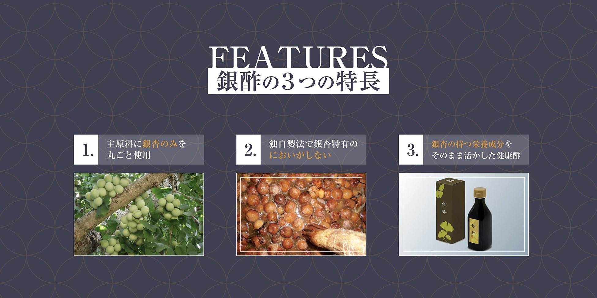 1.主原料として”銀杏のみ”、銀杏を丸ごと使ったお酢は他にありません。