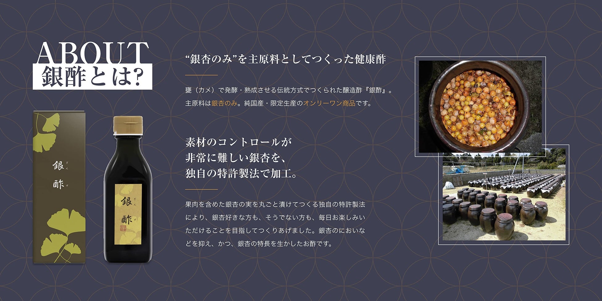 ”銀杏のみ”を主原料としてつくった醸造酢。特許製法により発酵・熟成させた、純国産・限定生産のお酢です。