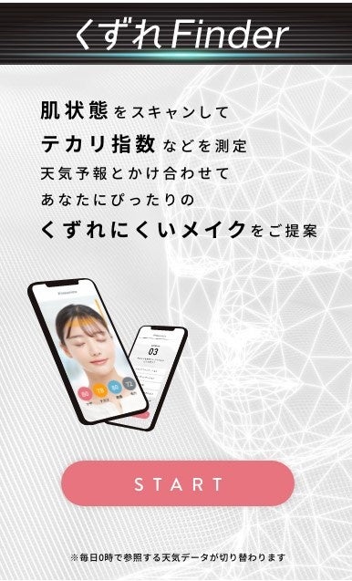 画像解析による肌解析で、化粧くずれに関する要素(ツヤ、テカリ、乾燥、毛穴目立ち)を可視化し、さらにその日の天気情報を元に、化粧くずれ対策についてベースメイクのアドバイスをしてくれるサービスです。