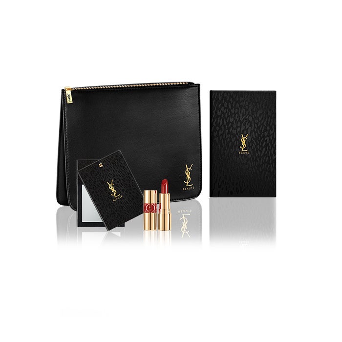YSLオリジナルノートとシックなポーチ、オリジナルミラーと「ルージュ ヴォリュプテ シャインNo.80」のミニリップまで。