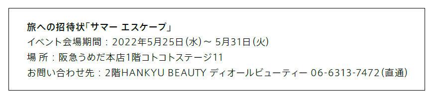 パルファン・クリスチャン・ディオールは、阪急うめだ本店1階コトコトステージ11にて期間限定 イベント「サマー エスケープ」を2022年5月25日(水)から5月31日(火)まで開催します。