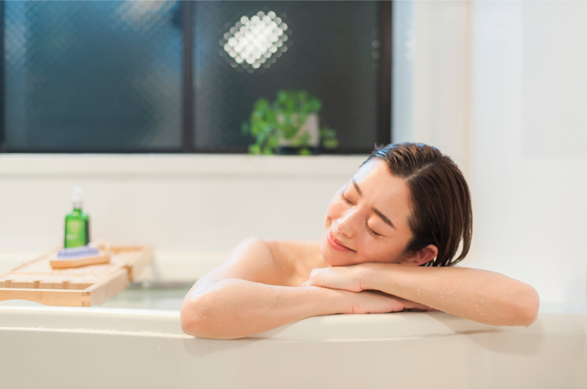 入浴時に身体が温まることによりほぐれやすくなり、胸周りや気になるパーツをマッサージしながら、深くゆっくりとした呼吸を行うことで、リラックスすることができ代謝アップにも繋がります。またバスルームではお湯を使うので蒸気で香りがたち、じっくりと香りを楽しむこともできます。