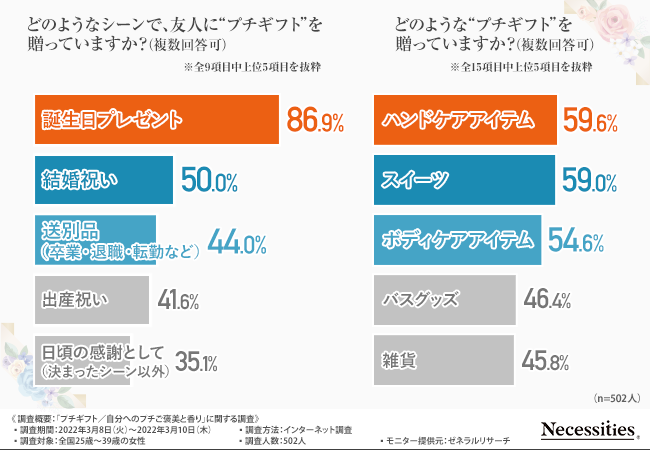 “プチギフト”の内容としては『ハンドケアアイテム』『ボディケアアイテム』『スイーツ』が多く、『見た目のおしゃれさ・可愛さ』にプラスして癒される『香り』のついているものを選んでいるようです。