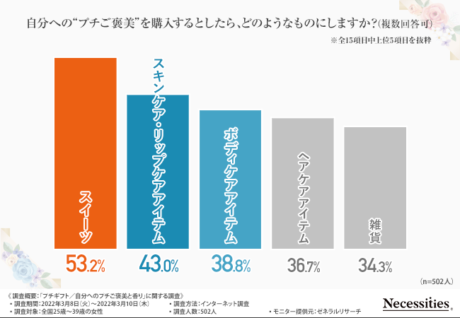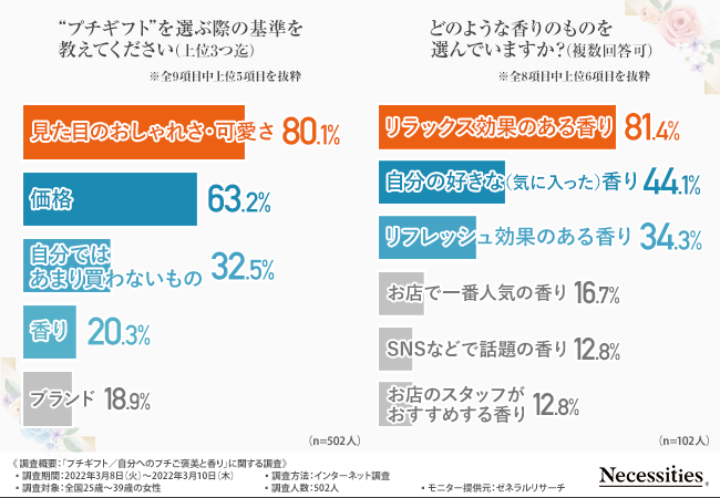 株式会社ネセシティーズジャパン(本社所在地:大阪府大阪市、代表取締役:鮫島 南々子)は、全国25歳~39歳の女性を対象に、「プチギフト/自分へのご褒美と香り」に関する調査を実施しました。