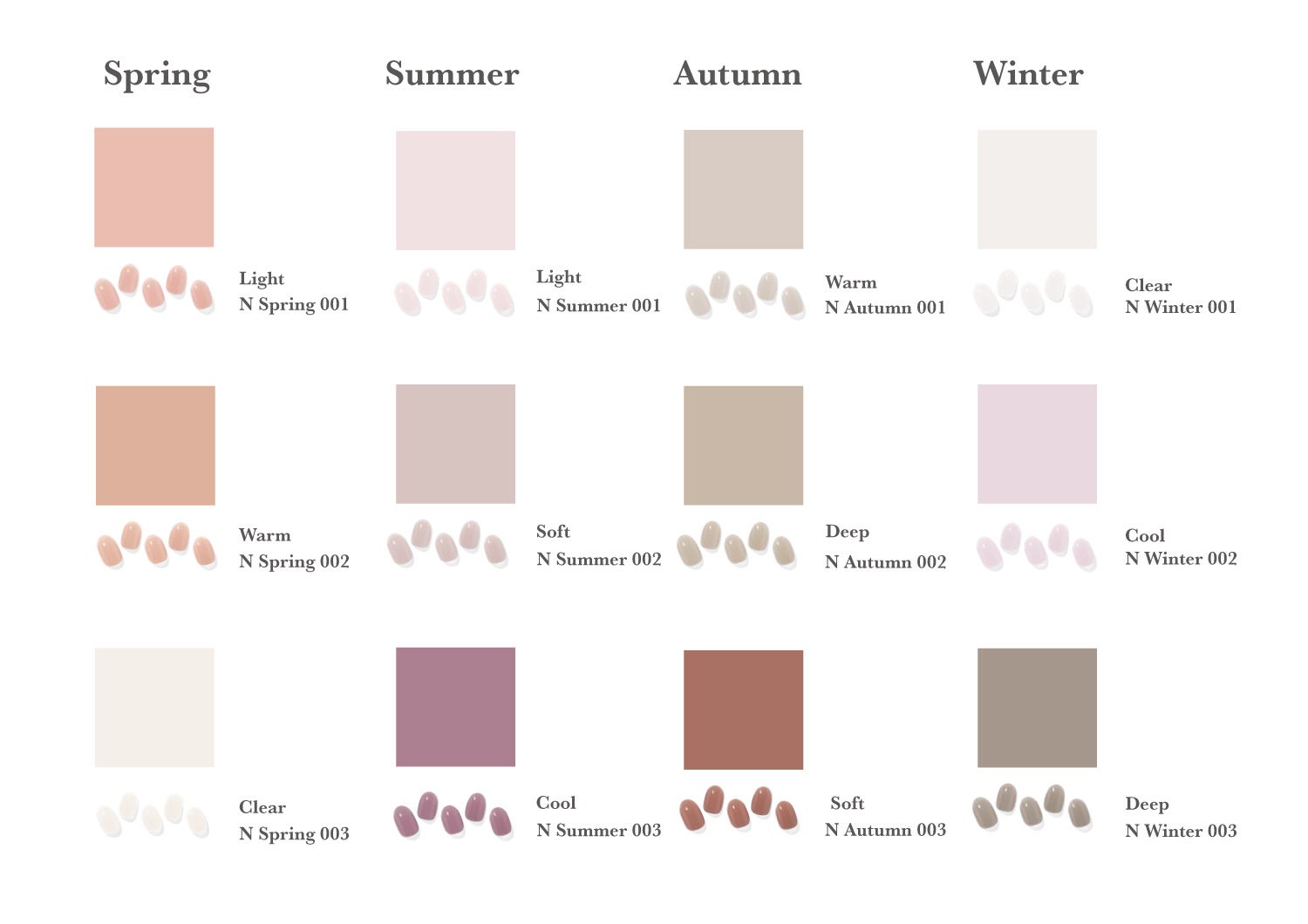 カラーコーディネータ監修の元、パーソナルカラーを基軸に大きく春夏秋冬の4タイプに分類し、ベースカラー、色の明度・彩度・清濁などの軸で、4タイプをさらに3種ずつ細分化した12色を展開。自分の肌色にぴったりのカラーリングを爪にほどこすことで指をより長く美しく見せ、ファンデーションでコントロールしずらい手肌や指先に健康的な血色感や透明感を演出します。
