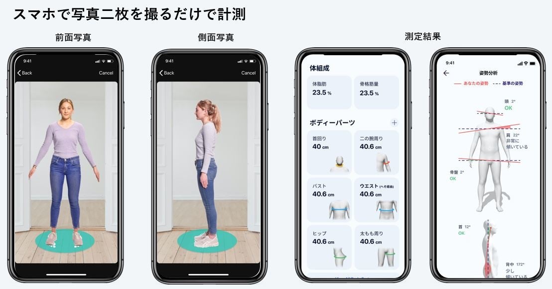 ボディグラムはAI(人工知能)の学習機能を駆使し身体サイズを推定する先進技術です。年齢・身長・体重・性別を入力し、服を着たまま、スマートフォンで正面と側面の2枚の写真を撮影するだけで被写体のボディラインを自動で検出し、腹囲・肩幅・手足の長さなど全身24ヶ所の推定計測が可能になります。これまで、BtoB事業にて制服やユニフォーム、百貨店といったアパレルをはじめ、寝具やヘルスケア領域へ技術提供・実用化を果たしており、今後もフィットネス、ウェルネスといった様々な分野での活用と展開を計画しています。また、自社アプリ「Bodygram」をApp Store及びGoogle Play で2020年6月に正式リリース。以降、スマートフォン1つで身体計測できる画期的なアプリとして20代から60代の幅広い年齢層ユーザーの関心を集め、ユーザー数は30万人を超え、iOSの無料アプリランキングで1位、Androidのヘルス&フィットネスのカテゴリーで1位※1を獲得しました。