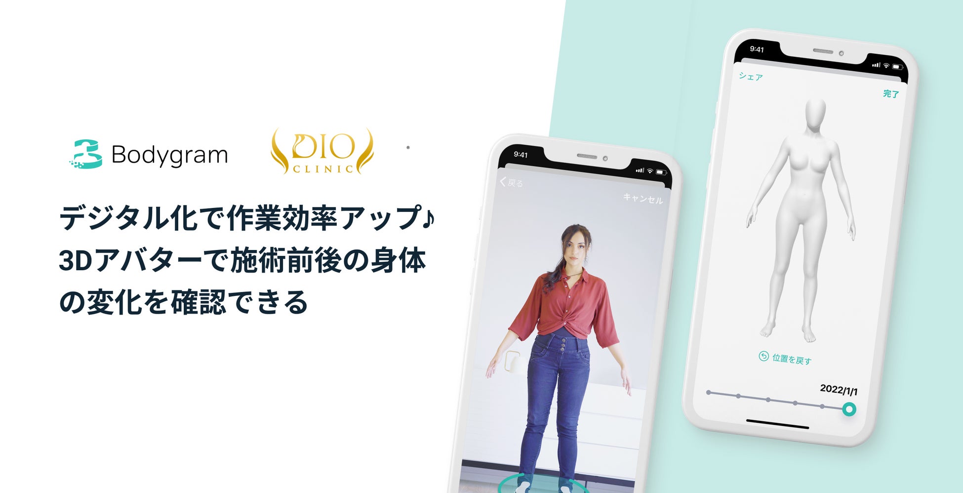 Bodygram Inc. (所在地:米国デラウェア州、CEO:Rei Aiba) はこの度、一般社団法人翔慶会(所在地:東京都千代田区、代表理事:畑下俊介)が展開するディオクリニック銀座院において、2022年4月末よりAI身体計測テクノロジー「Bodygram」が導入されたことを発表いたします。Bodygramのようにアプリでボディサイズが計測できる技術の医療痩身業界初の導入事例となります。