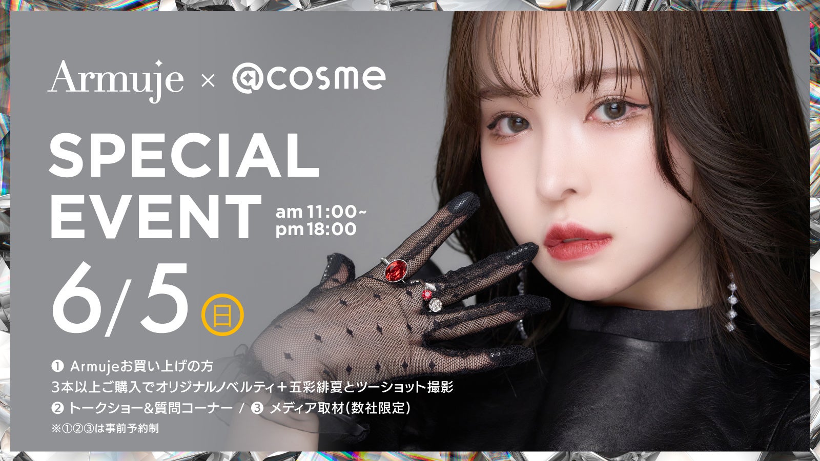 本イベントでは、五彩緋夏によるトークショーや来場者とのツーショット撮影会を行います。トークショーでは、「Armuje」の立ち上げから商品開発までの秘話をブランドマネージャー・櫻田茉由と語ったり、おすすめのメイク術などをお伝えする予定です。