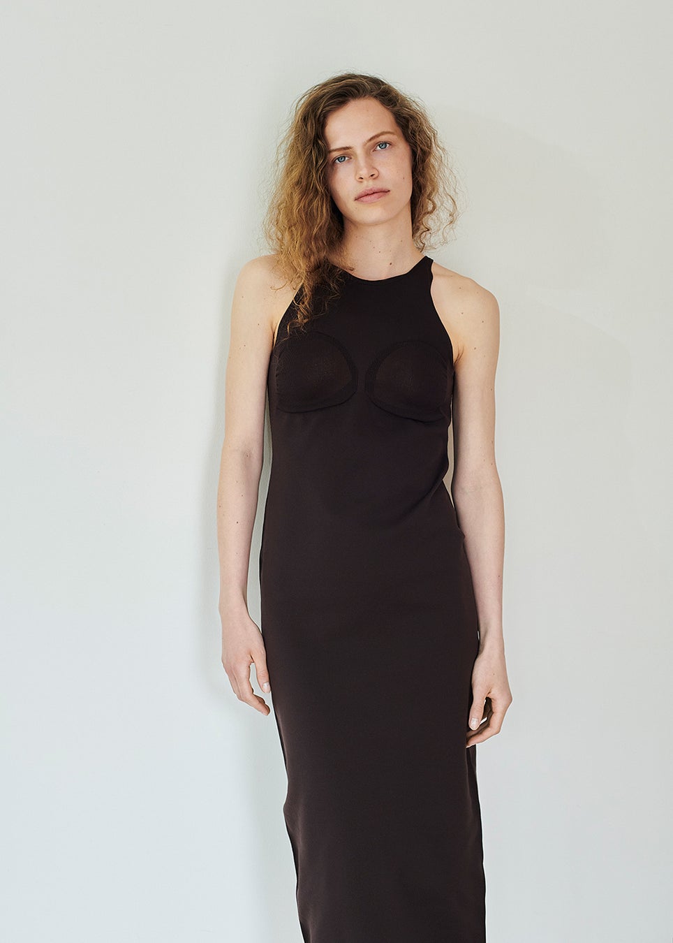 バスト部分のリブがデザインポイントのドレスは、アメリカンスリーブのきれいなラインが一枚で着用できます。