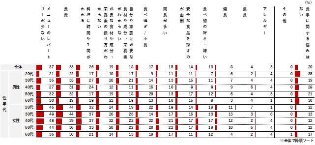 食生活において「メニューのレパートリーの少なさ」「食費」といった悩みが多い