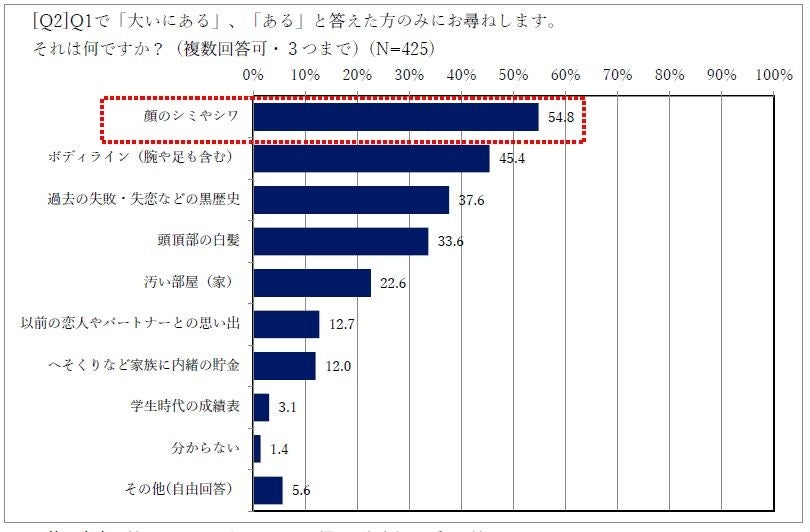 中でも大人女性の隠したいものとして半数以上の方が「顔のシミやシワ」を1 番に挙げています。