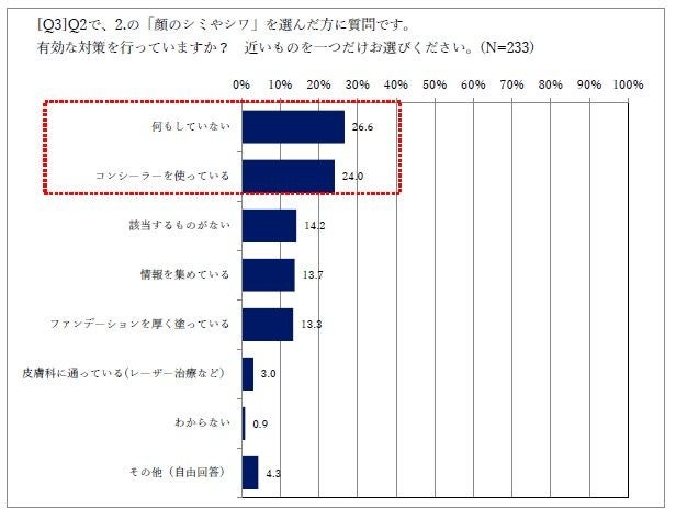質問3:第2問で「顔のシミやシワ」を選んだ方に質問です。有効な対策方法を行っていますか?近いものを一つだけお選びください。