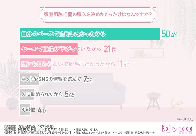 そこで、「家庭用脱毛器の購入を決めたきっかけはなんですか?」と質問したところ、『自分のペースで脱毛したかったから(50.4%)』と回答した方が最も多く、次いで『セールで値段が下がっていたから(21.1%)』『誰にも知られないで脱毛したかったから(11.5%)』と続きました。