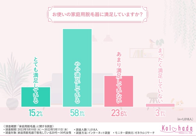 そこで、「お使いの家庭用脱毛器に満足していますか?」と質問したところ、とても満足している(15.2%)』『やや満足している(58.1%)』『あまり満足していない(23.6%)』『まったく満足していない(3.1%)という回答結果になりました。