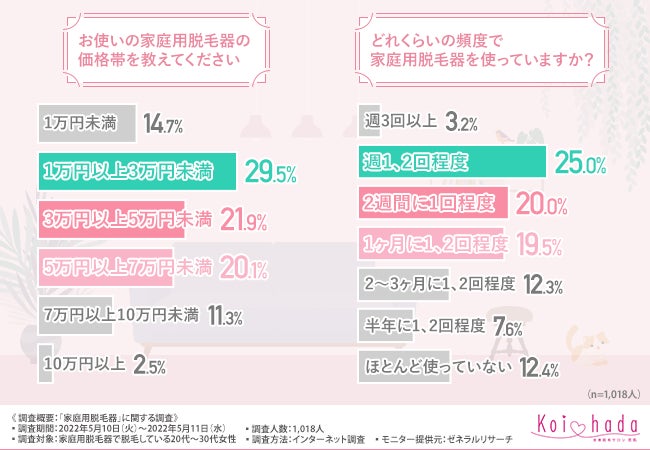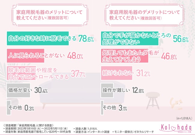 そこで今回、脱毛サロン「恋肌」https://www.koi-hada.jp/lplj_lv/lp03/?refmedia=178)は、家庭用脱毛器で脱毛をしている20代~30代の女性を対象に、「家庭用脱毛器」に関する調査を実施しました。