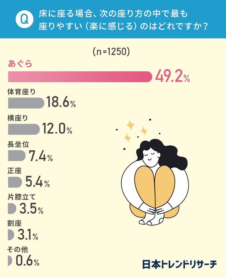 床に座るときに最も楽な座り方は「あぐら」、辛い座り方は「正座」という方が多くなりました。