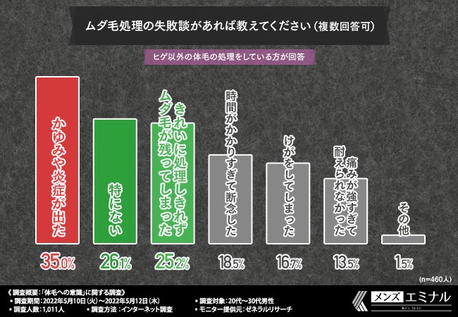 そこで、「ムダ毛処理の失敗談があれば教えてください(複数回答可)」と質問したところ、『かゆみや炎症が出た(35.0%)』と回答した方が最も多く、次いで『特にない(26.1%)』『きれいに処理しきれずムダ毛が残ってしまった(25.2%)』『時間がかかりすぎて断念した(18.5%)』『けがをしてしまった(16.7%)』『痛みが強すぎて耐えられなかった(13.5%)』と続きました。
