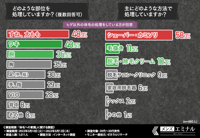 ヒゲ以外の体毛を処理している男性の割合、そして、その部位や処理方法などが分かりました。