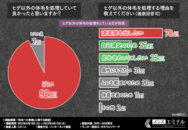 そこで、「ヒゲ以外の体毛を処理していて良かったと思いますか?」と質問したところ、9割以上の方が『はい(92.8%)』と回答しました。
