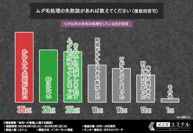 また、体毛を処理して良かったと感じている方は9割を超えましたが、きれいに処理しないと返って見栄えが悪くなることや、除毛クリームなどによる肌荒れや怪我には注意したいところです。