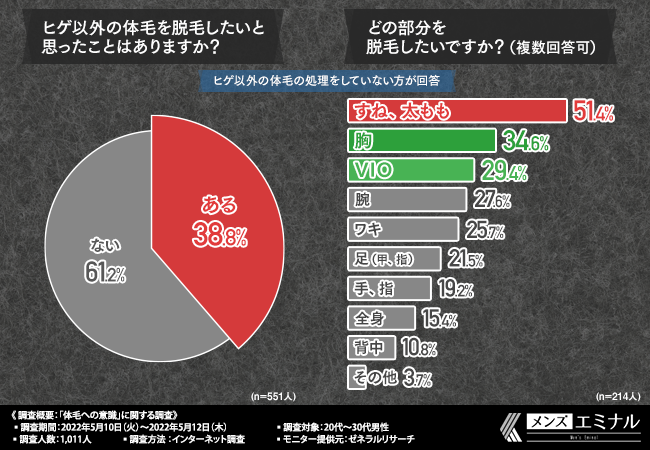そこで今回、メンズ医療脱毛クリニック『メンズエミナル』(https://mens-eminal.jp/lp/?refmedia=31073)は、20代~30代の男性を対象に、「体毛への意識」に関する調査を実施しました。