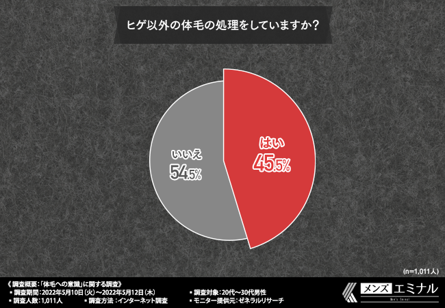 「ヒゲ以外の体毛の処理をしていますか?」と質問したところ、4割以上の方が『はい(45.5%)』と回答しました。