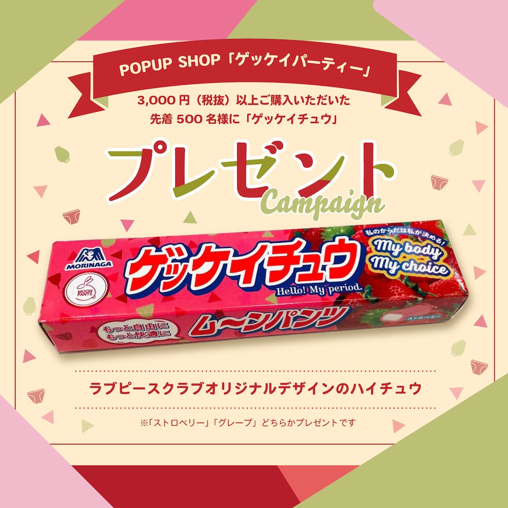 1996年に日本初※のフェムテックショップとして、生理用品やプレジャートーイを提案してきたLOVE PIECE CLUB(ラブピースクラブ)を運営する有限会社アジュマ(東京都文京区:代表北原みのり)は、月経を少しだけ楽しくポジティブに捉えられる、「ゲッケイパーティー 自分の身体を祝福しよう!」を、 5月28日月経衛生デーを含む1週間、5月25日(水)〜5月31日(火)にラフォーレ原宿2階CONTAINER にて開催します。 ※自社調べ