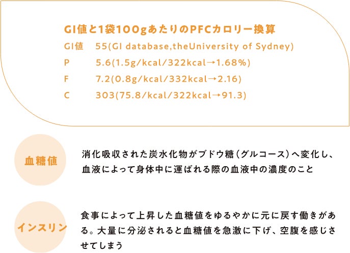 マッスルポテトのGI値は55。これは玄米やそばと同じくらいの数値と低く、糖質の吸収やインスリンの分泌を穏やかにし、空腹を感じにくくします。