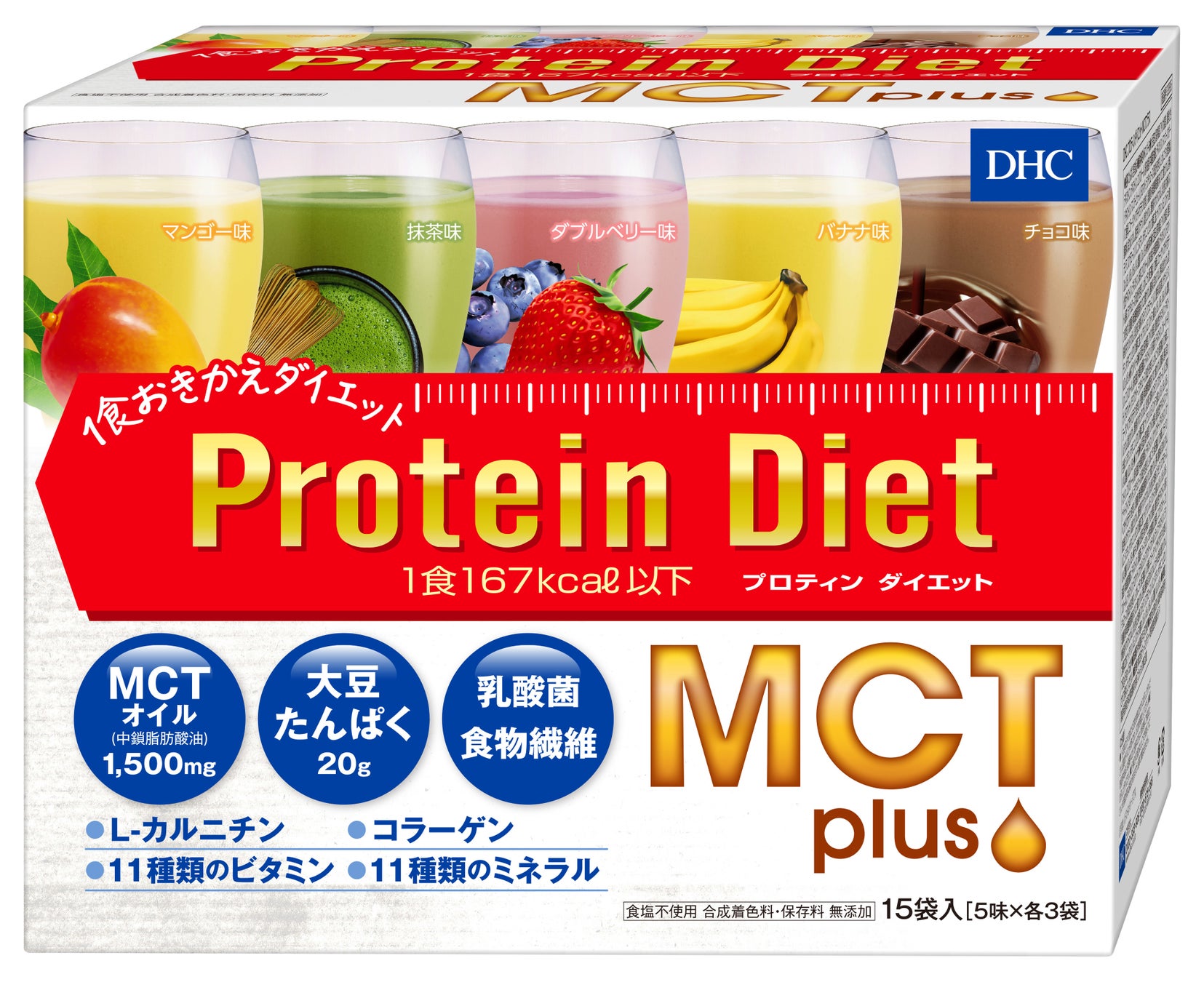 | 15食入(5味×各3袋) ¥5,120(税込¥5,529) 1食あたり167kcal以下 ★こだわりの5味 マンゴー味・抹茶味・ダブルベリー味・バナナ味・チョコ味 |