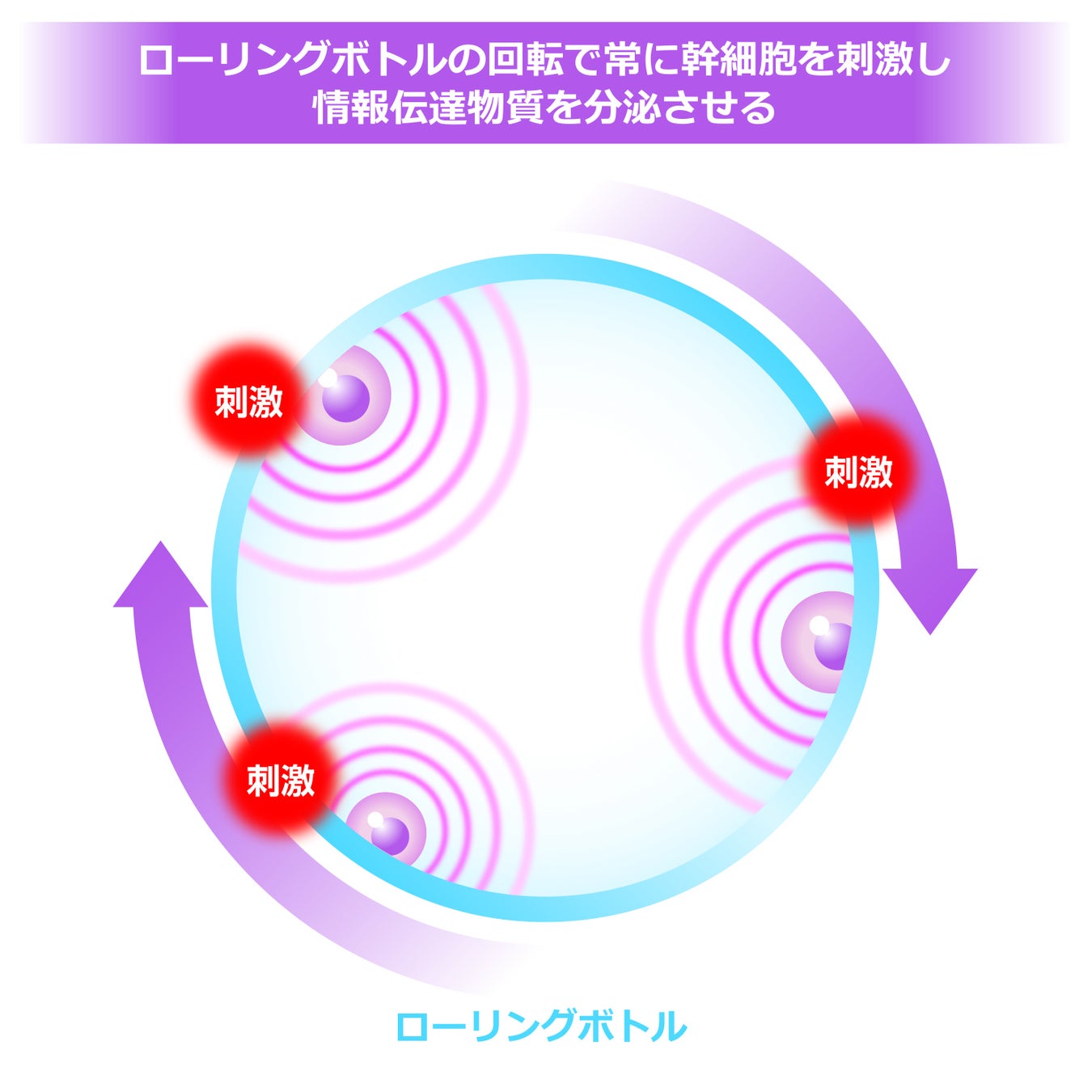 通常幹細胞は平たいフラスコやシャーレで培養されますが、アクティバートに採用されているヒト幹細胞培養液はローリングボトルという培養方法で幹細胞を培養しています。幹細胞は我々の体内にいるとき、平常時はほとんど仕事をしていません。何かトラブルが起きたときに、分化したり成長因子やエクソソームを分泌して、他の細胞に働きかけることでトラブルに対処しようとします。そのため化粧品原料を製造するために幹細胞を培養するとき、成長因子やエクソソームを分泌させるためには、トラブルが起きているという刺激を幹細胞に与える必要があります。ローリングボトルは培養器を回転させることで、培養液の水流が起き、その水流が幹細胞を刺激します。そのためローリングボトル方式と通常の培養法を比較すると、成長因子などのタンパク質やエクソソームはローリングボトル方式の方が、約10倍多く分泌されます。