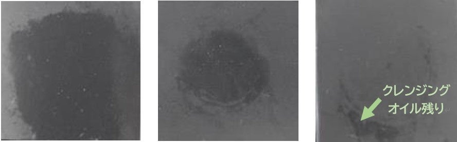 I)黒色の人工角栓を作成し、人工肌模型に塗布し乾燥させる。II)各種クレンジング剤0.7 mLを滴下し、10秒間指でなじませる。III)水を0.1 ml加え、10秒間指でなじませながら乳化させる。IV)ぬるま湯で洗い流す。