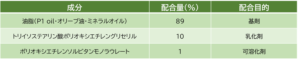 P1 oil™配合クレンジングオイルを表に示す処方の通り作製し、リキッドファンデーションおよび人工角栓をどれだけ除去することができるか植物油であるオリーブ油と比較して試験を行いました。また、クレンジングオイルの乳化性および水洗後の残留について、オリーブ油やミネラルオイルとの比較を確認しました。