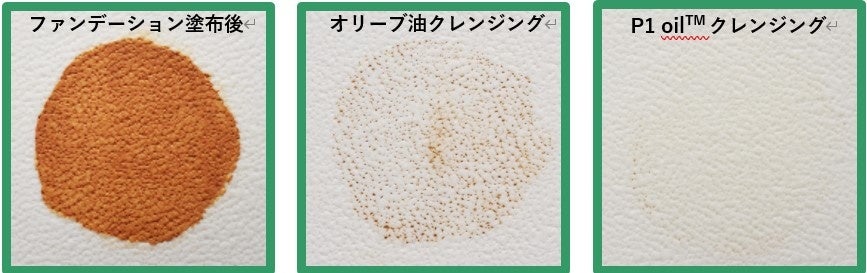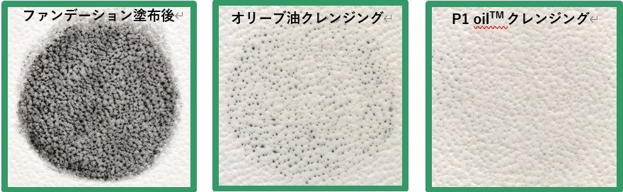 P1 oil™配合クレンジングでは、落としづらい毛穴の中のファンデーションまできれいに除去できることを確認致しました。