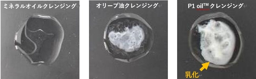 P1 oil™配合クレンジングは乳化性が良く、水洗後のクレンジングオイル残りが少ないことを確認致しました。