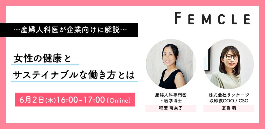 予防医療テックで職域向けにオンライン診療など健康支援プログラムを提供する株式会社リンケージ(本社:東京都中央区、代表取締役社長:生駒恭明)は、2022年6月2日(木)16時より、女性の仕事と体調の関係性について学べる無料ウェビナー「女性の健康とサステイナブルな働き方とは 〜産婦人科医が企業向けに解説〜」を開催します。