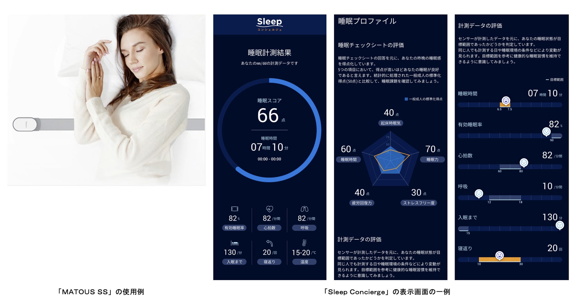 (1)「Sleep Concierge」は、専用デバイス「MATOUS SS(マトウス エスエス)」をシーツなどの寝具の下に設置して就寝することで、睡眠中の体動情報やバイタルサインを計測して、睡眠時間、睡眠の深さ、中途覚醒、寝返りなどの睡眠の質を評価し、睡眠習慣の改善に向けたアドバイスを提供するサービスです。