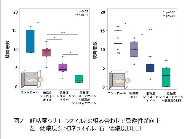 忌避素材の効果を検証するため、蚊の飼育用ケージを用いて蚊の行動を観察しました(AIC試験)。25匹の蚊が入ったケージに、従来の忌避成分濃度の10分の1~100分の1のシトロネラオイルを配合した製剤(表面の付着量4 g/cm2)を塗布した前腕を入れ、蚊の前腕への降着行動を観察しました。その結果、低濃度のシトロネラオイル単独では弱い忌避効果しか示さなかった一方で、低粘度シリコーンオイル(表面の付着量0.2 mg/cm2)と低濃度のシトロネラオイルを組み合わせた製剤では、蚊の忌避性が大幅に向上し、蚊の降着数が顕著に減少しました(図2左)。またこの効果は、単独では効果を示さない極めて低濃度のDEET(表面の付着量0.2 g/cm2)と組み合わせた場合においても確認できました(図2右)。