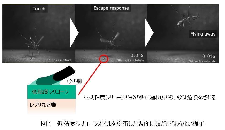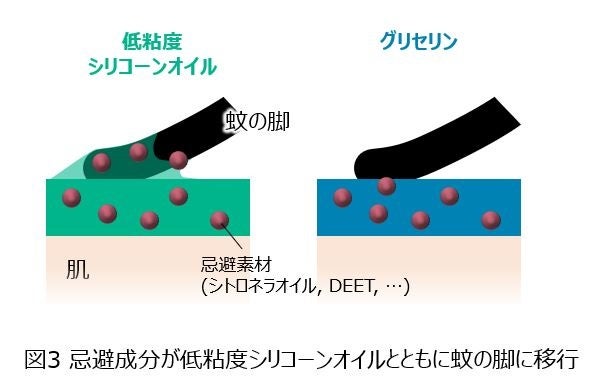 蚊は脚にある感覚受容体で化学物質を受容することが知られています。蚊の脚にシトロネラオイルが移行すると、脚の感覚受容体がシトロネラオイルを検出し、蚊が表面をより嫌なものとして感じる可能性があります。すなわち、ヒトの肌に低粘度シリコーンオイルと組み合わせたシトロネラオイルやDEETを塗布することで、蚊に刺される数を低減できると考えられます。